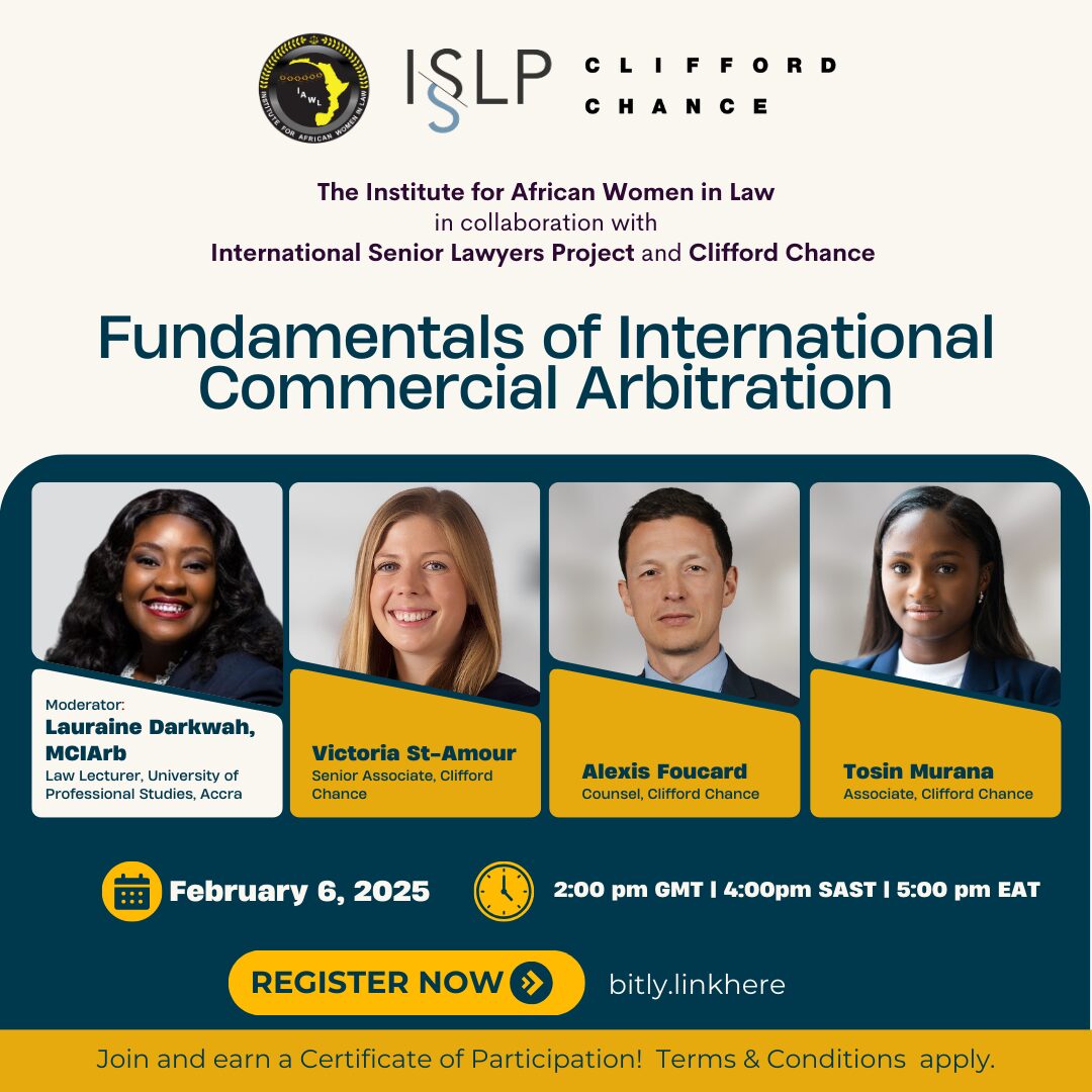 International Senior Lawyers Project and Institute for African Women in Law partnered to host an expert session on Fundamentals of International Commercial and Investment Arbitration with ISLP volunteer lawyers Tosin Murana, Victoria Stamour, and Alexis Foucard from Clifford Chance. The event was moderated by IAWL’s Lauraine Darkwah, law lecturer at the University of Professional Studies in Accra, Ghana, and drew more than 200 participants from diverse legal backgrounds, including judges, legal scholars, practicing lawyers, and law students. The session is part of an ongoing commitment by ISLP and IAWL to strengthen legal capacity and foster inclusivity within the profession. The speakers provided practical insights into arbitration practice and key developments for practitioners engaging in cross-border dispute resolution.
