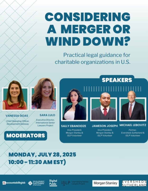 strategic partnerships, and wind downs are increasingly on the table, as nonprofit and civil society organizations around the world adapt to new funding challenges and navigate an increasingly complex operating environment. Responding to widespread interest and need in the sector, ISLP partnered with Accountability Lab, Digital Public, and Development Gateway to to present a three-part webinar series to help demystify legal processes and provide practical guidance to enable sound planning and risk mitigation. The Mergers and Wind Downs: Practical Legal Guidance for Charitable Organizations series focused on the U.S., Kenyan, and UK contexts but covered concepts and practical guidance transferable across jurisdictions. Explaining key obligations and legal considerations, ISLP volunteers addressed governance, tax, intellectual property, labor questions and more to help management and boards identify decision and compliance points, mitigate risks, and avoid costly pitfalls. ISLP thanks our volunteers from Eversheds Sutherland, Morgan Stanley, Ashitiva Associates LLP, Waithira M & Co Advocates, Bates Wells, and Womble Bond Dickinson who shared their expertise.
